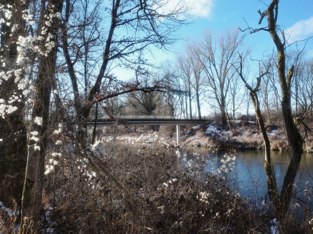 Ein kalter klarer Wintermorgen in Vordersibirien, kaum jemand sonst unterwegs. Weniger Schnee als in der Stadt, beste Gehverhältnisse. Kurze Straßenpassage, dann tauchen wir beim Gut Erching in die Isaraue ein, gehen auf dem Hochuferweg nach Süden, in aller Stille. Wären da nicht die ewig startenden Flieger, die in alle Richtungen davonschwirren. Nach etwa einer Stunde sind wir am Dietersheimer Isarsteg, 1979 errichtet für unsereiner, zu einer Zeit, als Naherholung im Aufwind war und noch kein Flughafen nebenan.