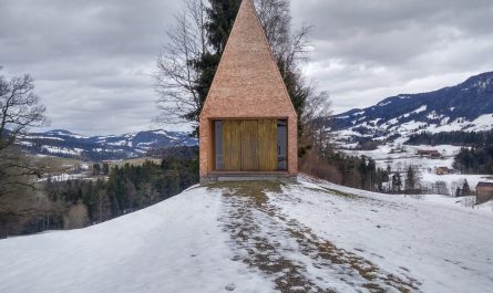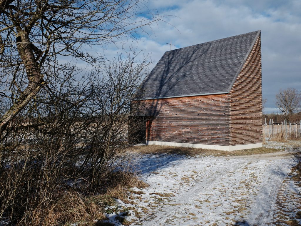 Als wir den Auwald in Richtung Dietersheim verlassen, überrascht uns ein kleines, skulpturales Gebäude neben dem Weg: die neue Kreuzwegkapelle von 2024, entstanden aus einer Initiative örtlicher Bürger, geplant von den ortsansässigen Architekten Büro 4. Leider nicht offen (wohl nur bei Veranstaltungen), aber man kann die suggestive Atmosphäre des Innenraums ahnen. Das kleine Bauwerk ist komplett aus dicken Bohlen aus unbehandeltem Douglasienholz gebaut und hat lediglich kleine rechteckige Lichtöffnungen, davon aber 51 an der Zahl. Es bildet ein schützendes, schreinartiges Gehäuse für einen Wandteppich, der 14 Kreuzwegstationen abbildet. 50 Jahre lang hing er in einer Abtei im Saarland und hat hier nun eine dauerhafte Bleibe gefunden. Sehr schöner, gelungener Ort, der ein wenig an die Kapelle Salgenreute im Bregenzerwald erinnert.