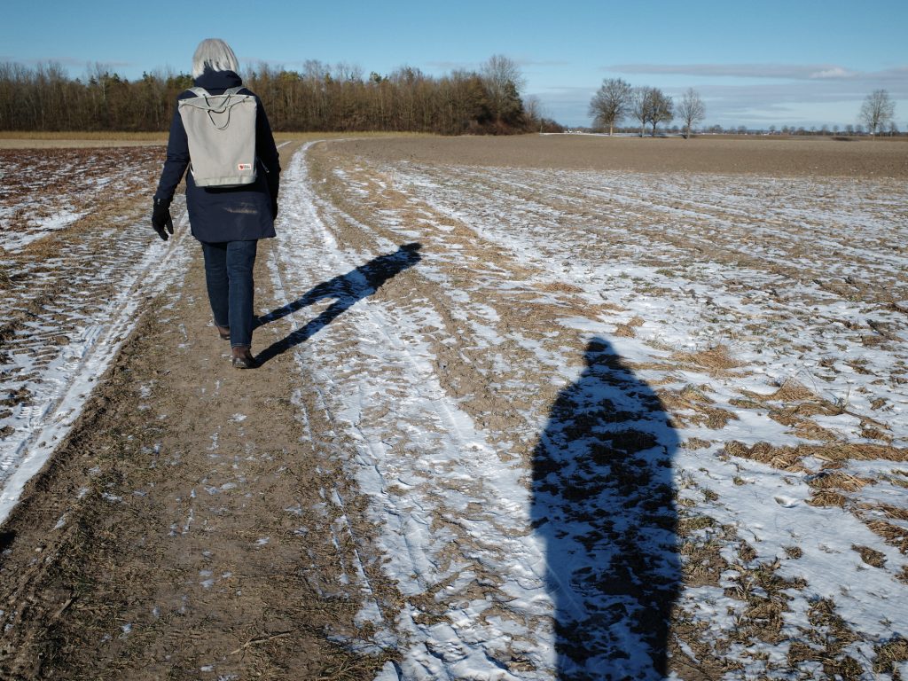 Über fünf Jahre ist es her, dass wir von Dachau nach Lohhof gewandert sind, Zeit für eine Fortsetzung. Bislang sind wir im Uhrzeigersinn gegangen, heute einmal andersrum: so kriegen wir mehr Wintersonne ins Gesicht, außerdem war die ÖPNV-Verbindung etwas geschmeidiger. Wobei es ein eigenartiges Gefühl ist, zwischen lauter Flugtouristen zu sitzen und dann selber kurz vor dem Flughafen, im Niemandsland, wo es nichts gibt als einen großen Parkplatz, auszusteigen, nur mit einem kleinen Rucksack.